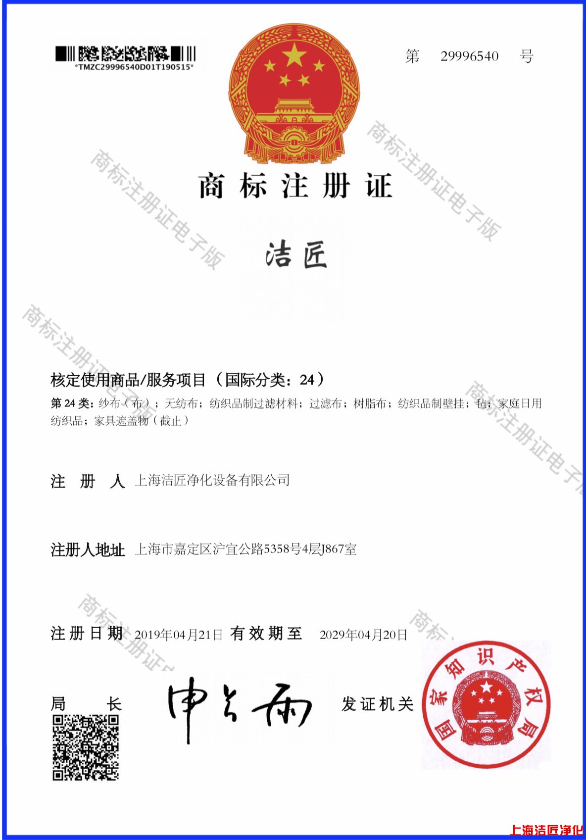 為提升企業(yè)競爭力,業(yè)務(wù)發(fā)展和品牌塑造,上海潔匠凈化設(shè)備有限公司申請的潔匠?商標(biāo)證特此公告!